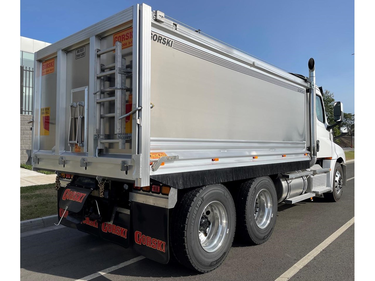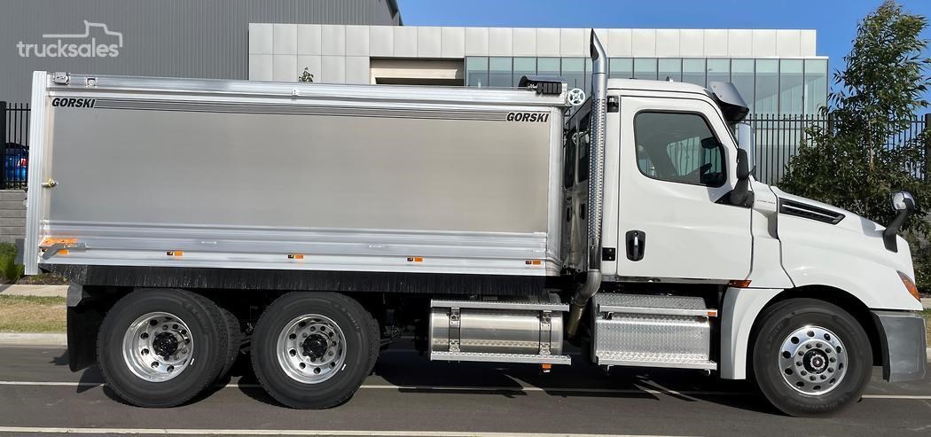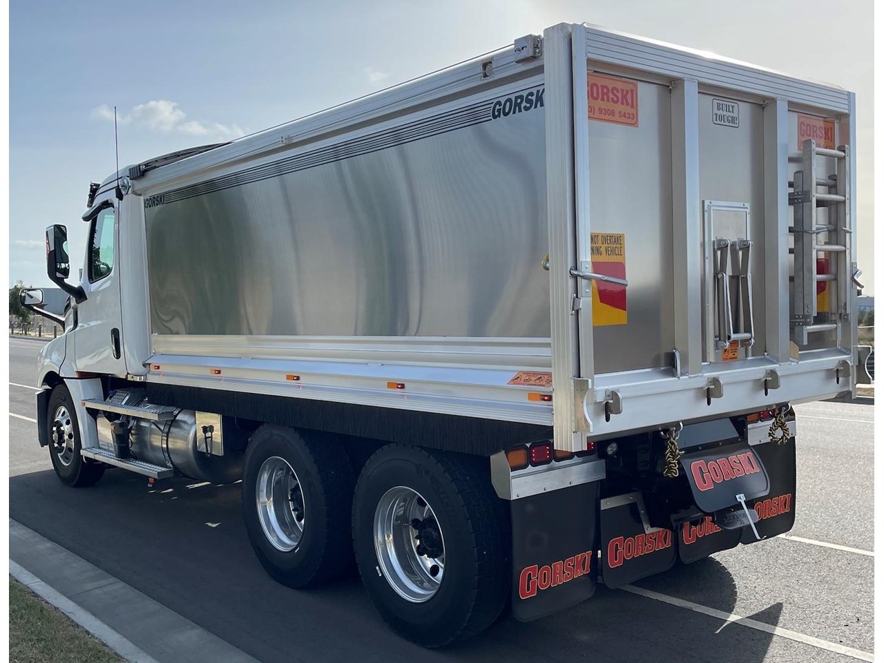 Cascadia 126 equipped with the latest safety technology Detroit Assurance 5.0 including Lane Assist, Side Guard Assist, Active Brake Assist, Adaptive Cruise Control, Auto Head Lamps & Freightliner Cascadia 126 with Gorski Engineering Alloy quarry spec tipper body with razor electric mesh tarp & rock sheets.