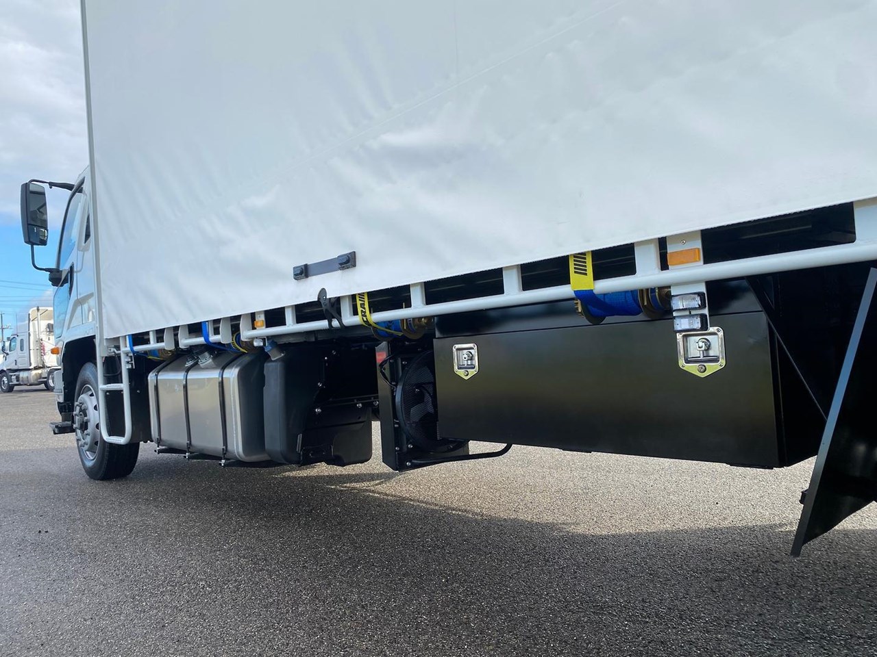- Curtains: Blue lightning latch curtains for easy and secure loading