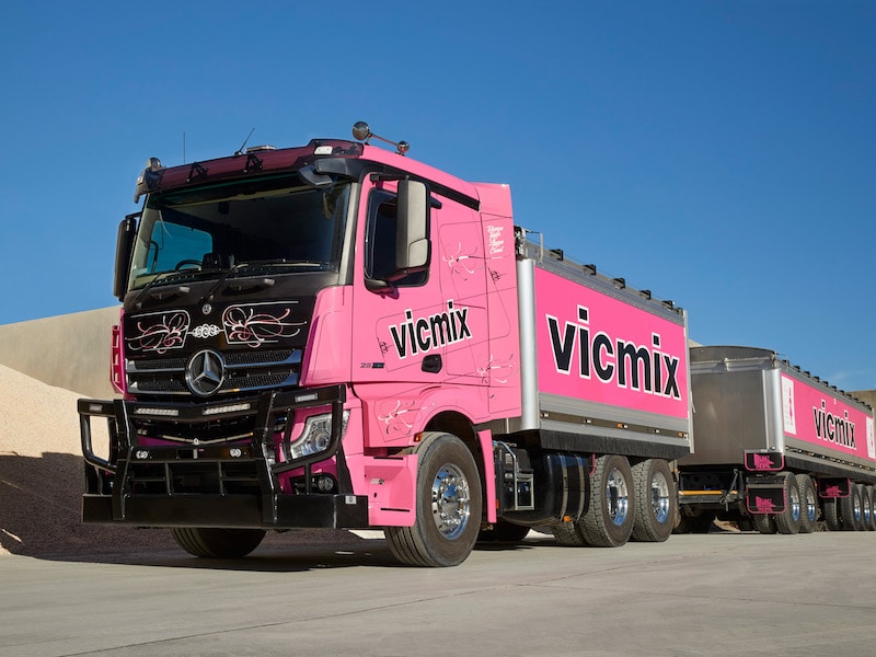 VicMix, which now sports several Mercedes-Benz Actros trucks in its own fleet, runs a distinctive pink paint scheme that not only stands out but also raises awareness for Breast Cancer Australia, an organisation the company supports.